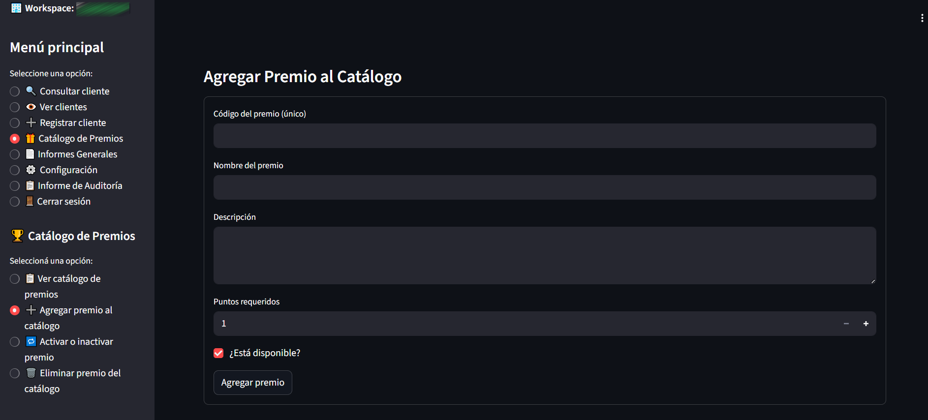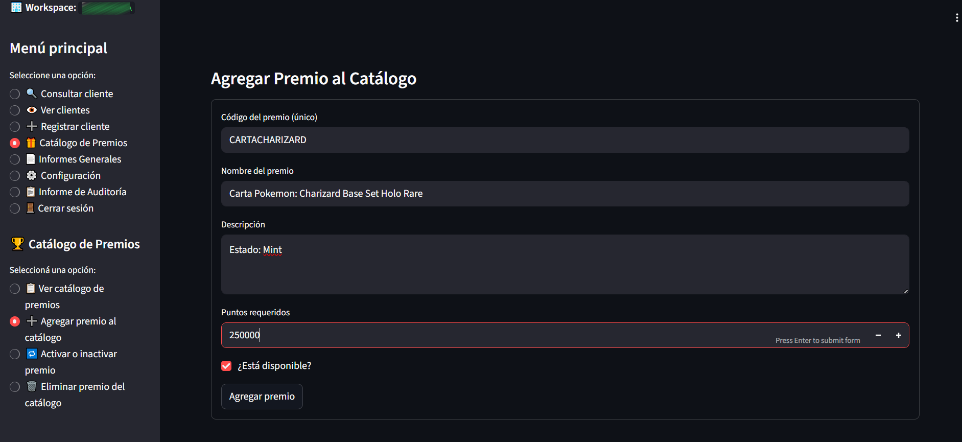 Se debe ingresar el código del premio (Debe ser único e irrepetible, si está repetido aparecerá un mensaje de error). Ingresar el nombre, una breve descripción o detalle del premio (opcional) y los puntos que requiere para ser canjeado.