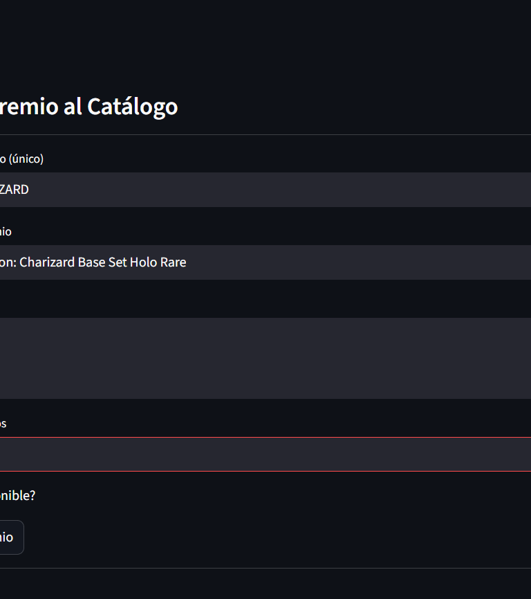 El checkbox "¿Está disponible?" indica si está activo o inactivo, si el premio se encuentra inactivo no podrá ser canjeado.