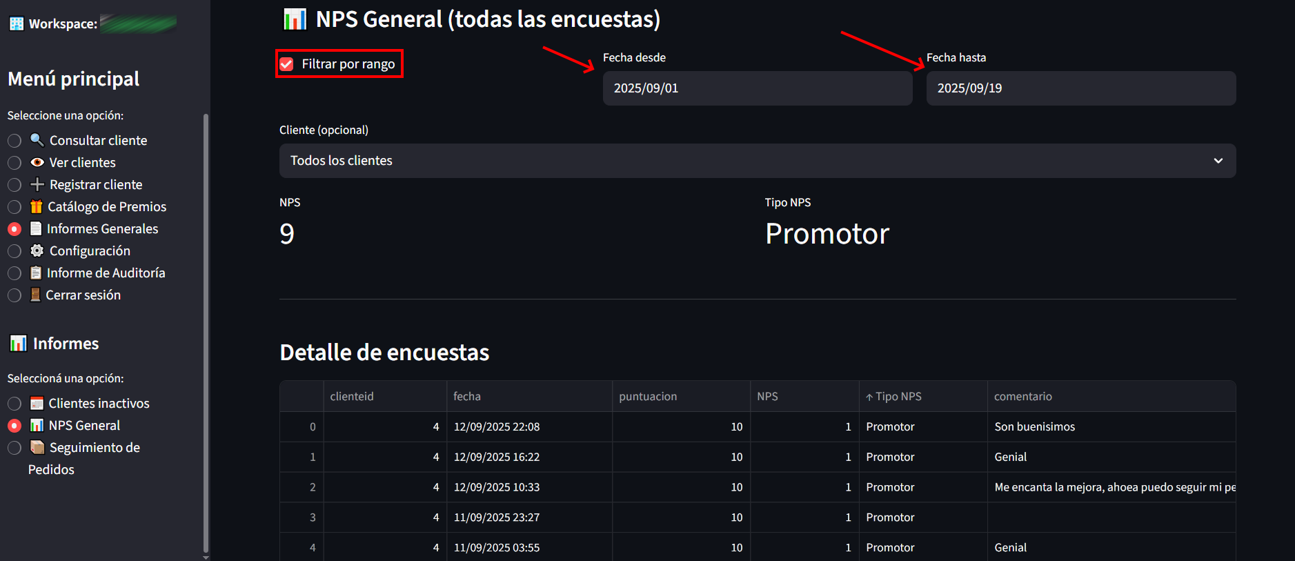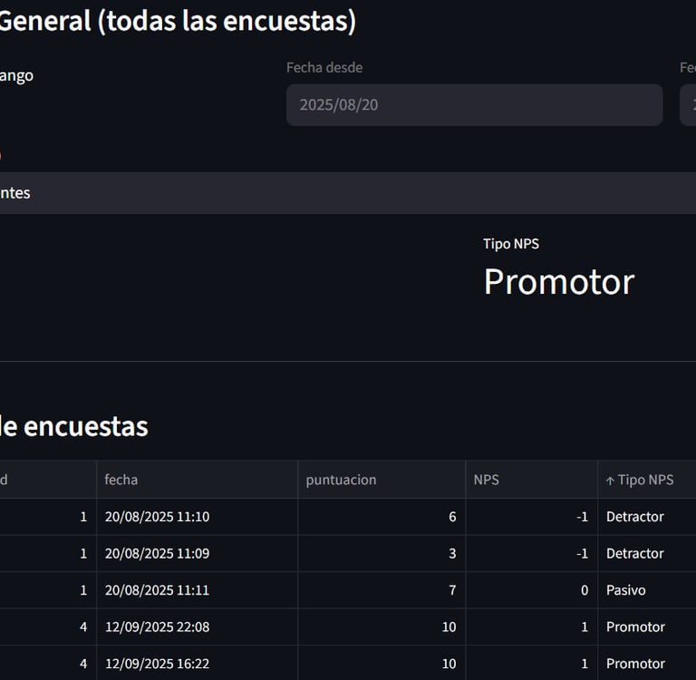 En este informe podrás visualizar todas las encuestas de satisfacción de todos los clientes dentro de un periodo de tiempo, también se podrá filtrar por cliente y visualizar el detalle de cada una.