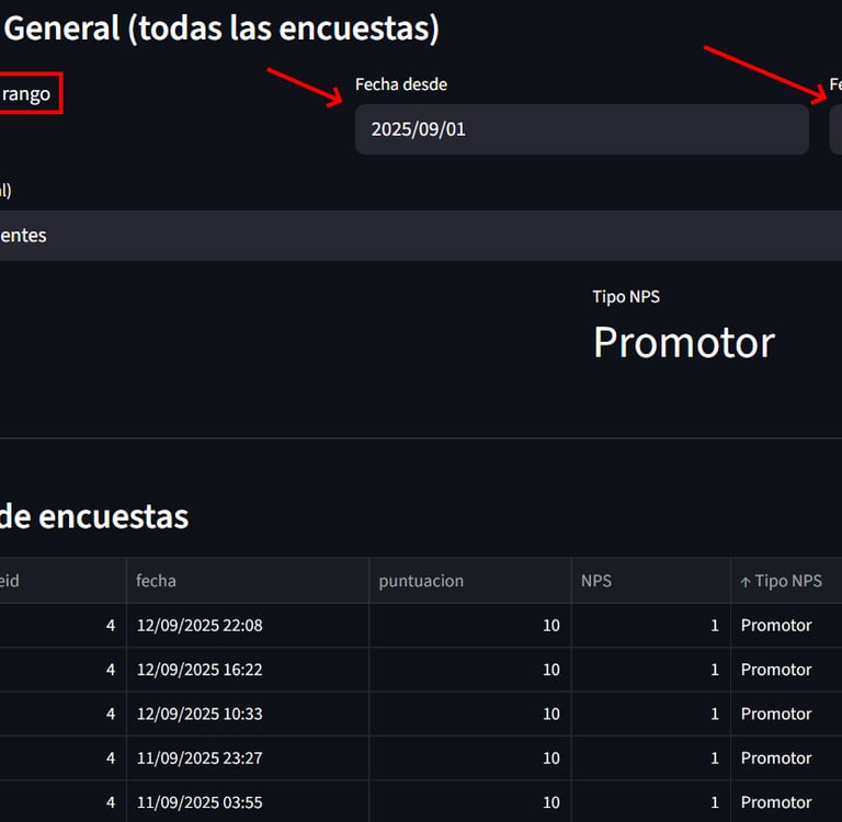 Hay un checkbox a nivel superior que activa o inactiva la posibilidad de elegir rango de fechas, por defecto esta inactivo y muestra todas las encuestas hasta el día de hoy.