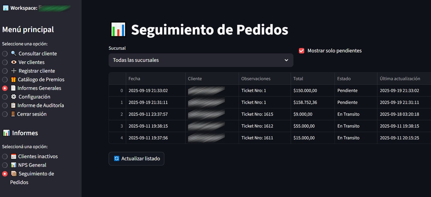 En el menú principal se podrá ingresar a la opción "Informes Generales", en la parte inferior del menú aparecerá otro menú de informes con la opción de "Seguimiento de pedidos".