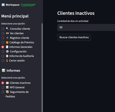 En el menú principal se podrá ingresar a la opción "Informes Generales", en la parte inferior del menú aparecerá otro menú de informes con la opción de "Clientes inactivos".
