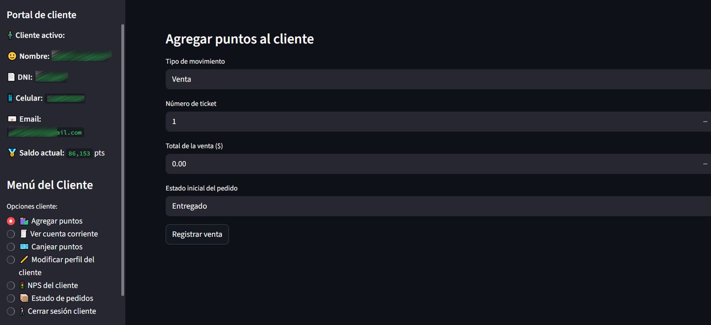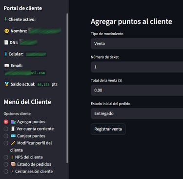 En la opción de "Agregar Puntos" podrás registrar puntos al cliente. Hay tres tipos de movimientos: "Venta", "Ajuste", "Regalo".