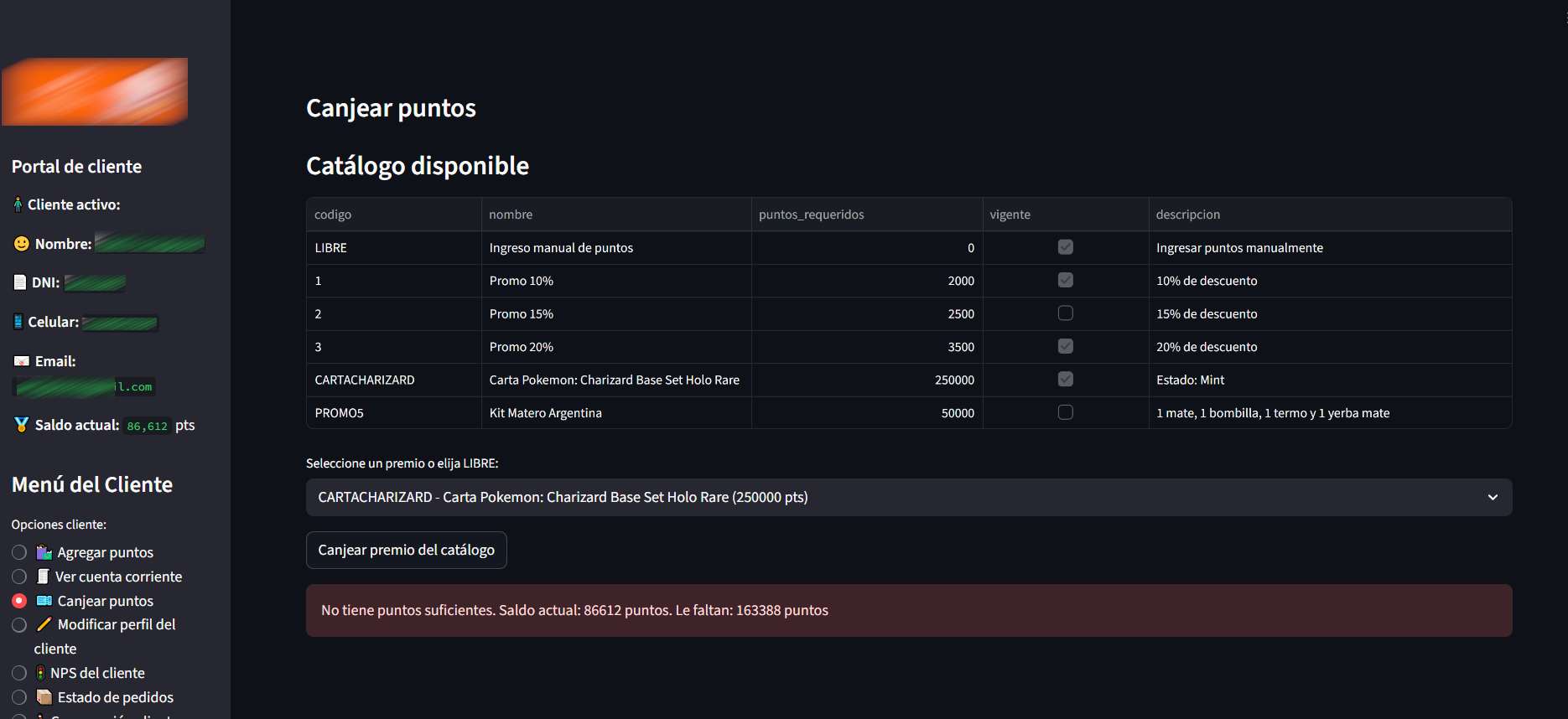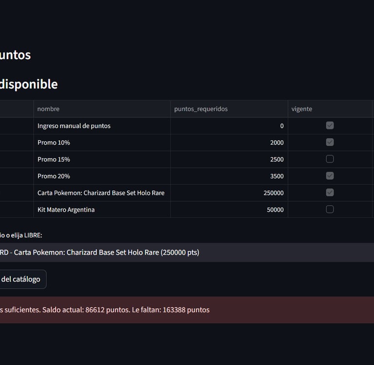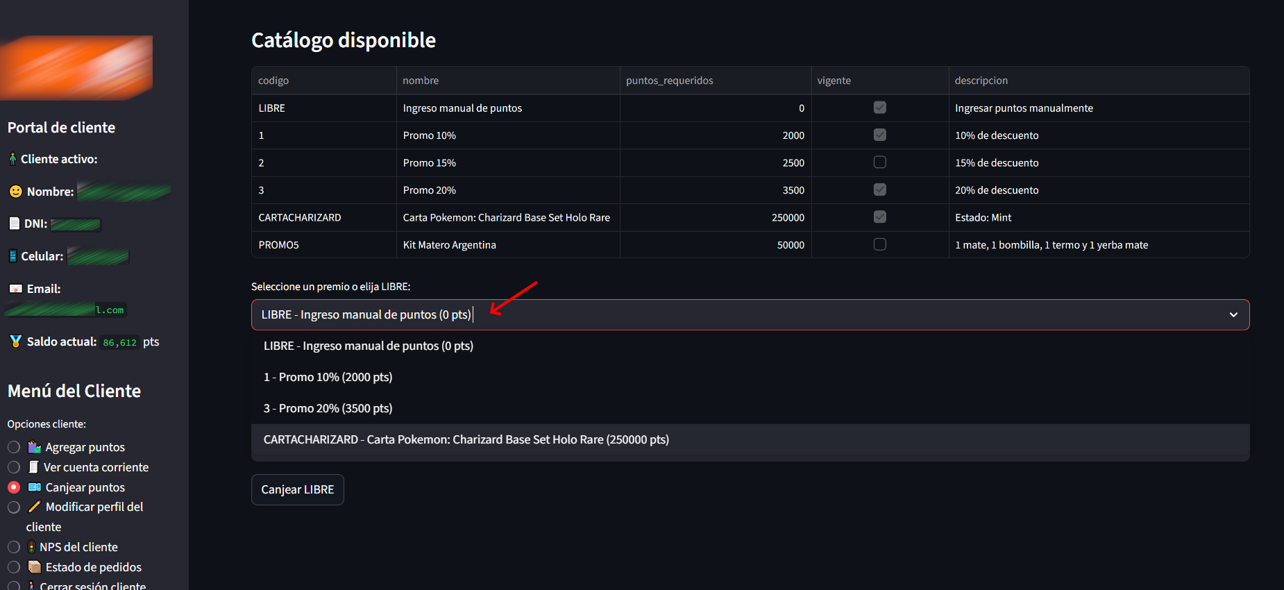Si se selecciona tanto por LIBRE como por un premio puntual que sus puntos son superiores a los puntos actuales del cliente, no se va a poder realizar el canje correspondiente. Por ejemplo, en este caso, se intenta realizar un canje de un premio de 250.000 puntos mientras que el saldo del cliente es de 86.612 puntos.