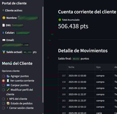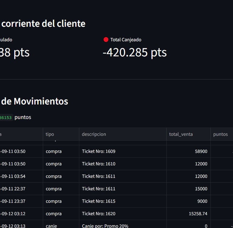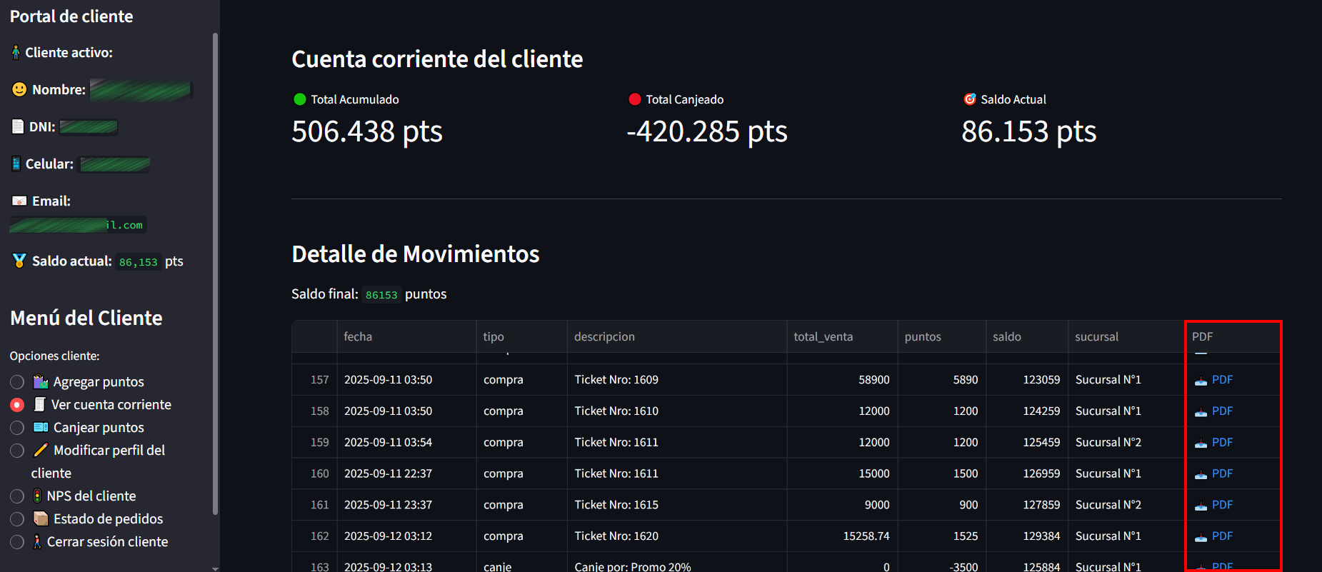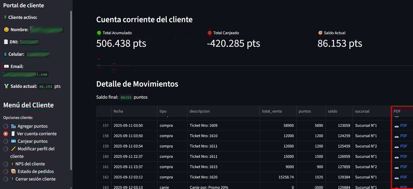 En la opción de "Ver cuenta corriente" visualizar el histórico de puntos agregados y canjeados del cliente y en que sucursal en caso que la empresa comparta información entre todas sus sucursales. Hay una columna llamada "PDF" con un botón para poder descargar un comprobante por la Venta, Ajuste, Regalo o Canje.