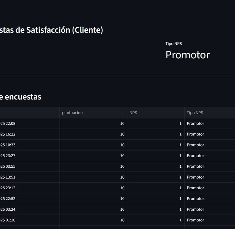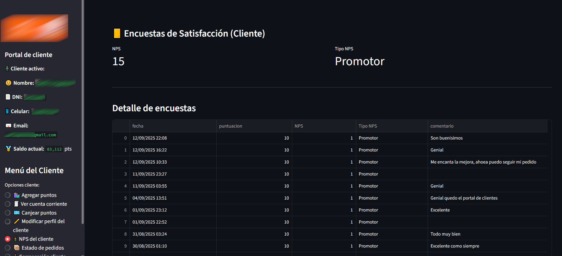 En la opción de "NPS del cliente" se podrá visualizar el histórico calificaciones en la encuesta de satisfacción que se encuentra en el Portal de clientes que consulta cada uno con sus datos.