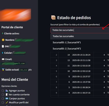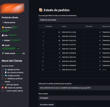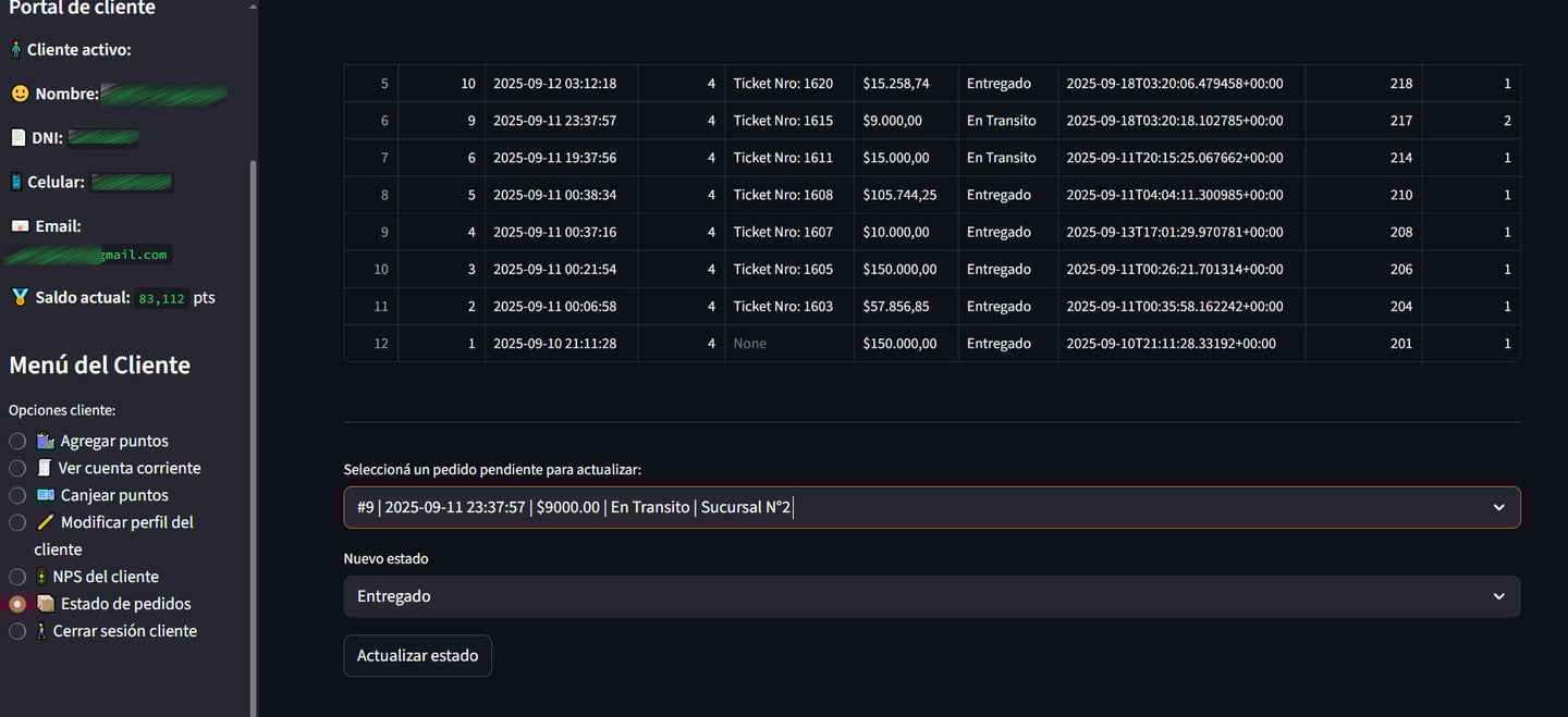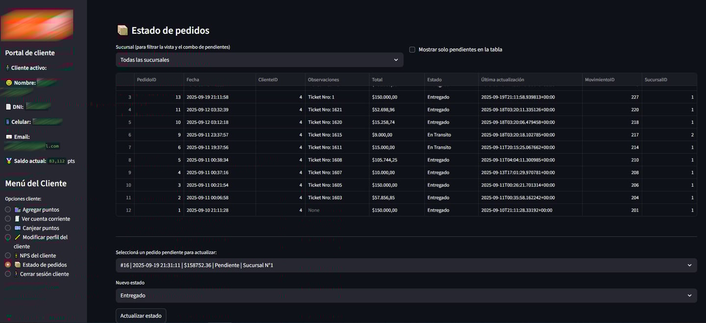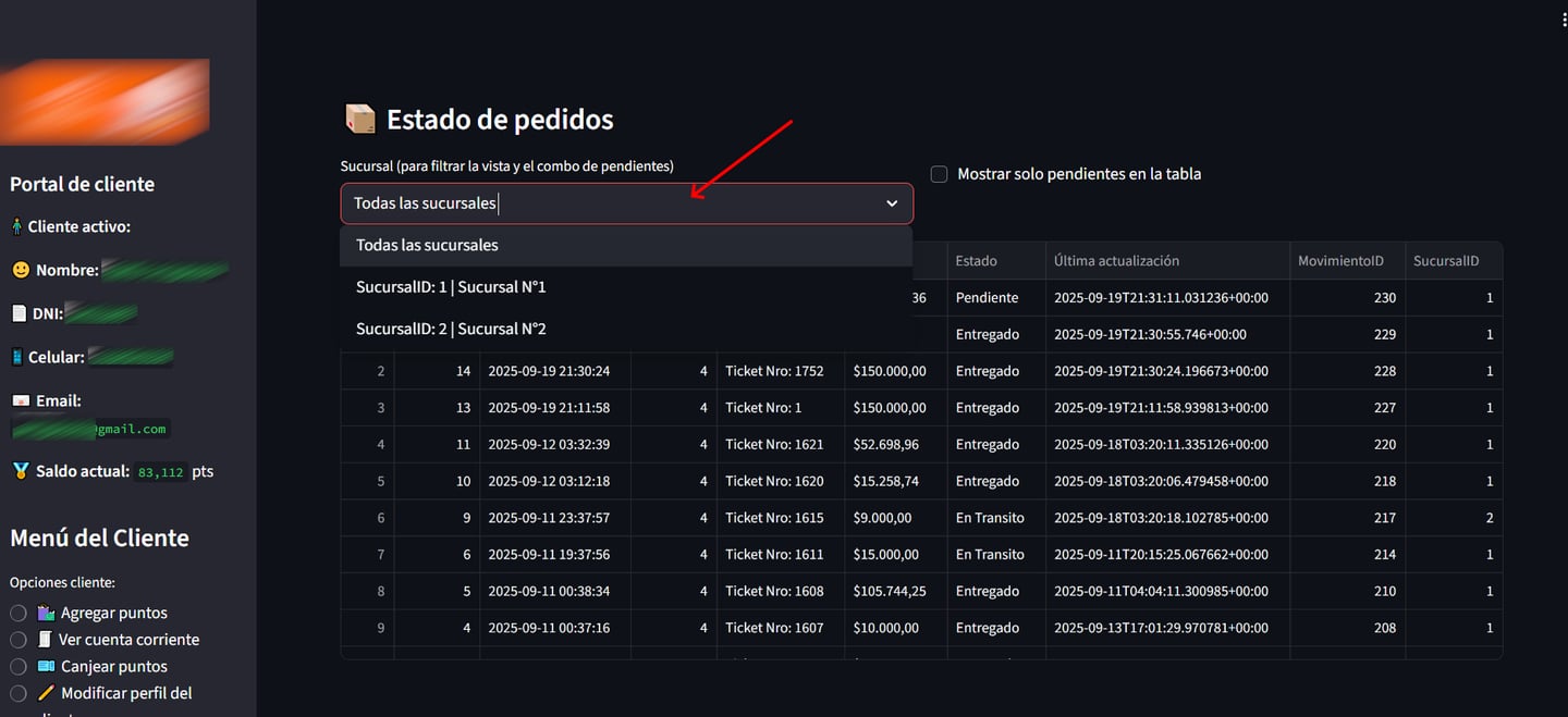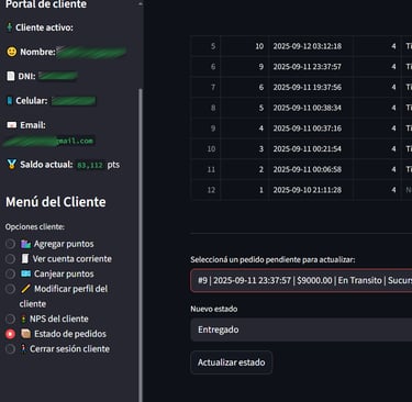 Una vez seleccionado, se agrega el nuevo estado y se presiona sobre el botón "Actualizar Estado". Ese cambio de estado se verá reflejado en la tabla de arriba, como tambien en el Portal de Clientes que consulta cada uno de sus clientes para consultar sus puntos y ver el seguimiento de sus pedidos.